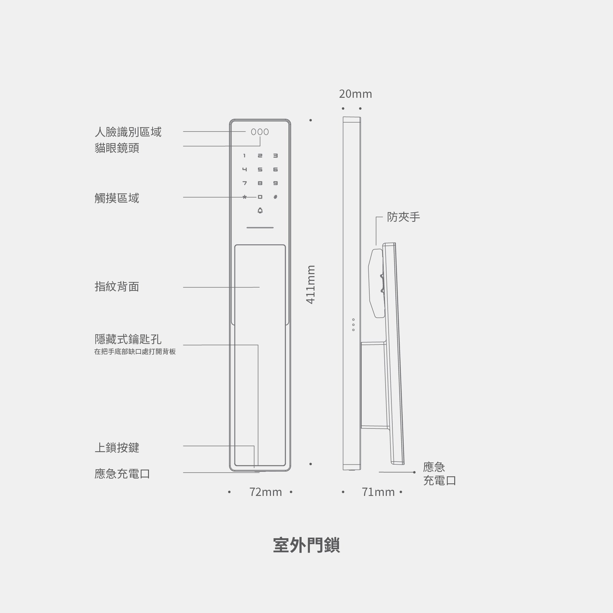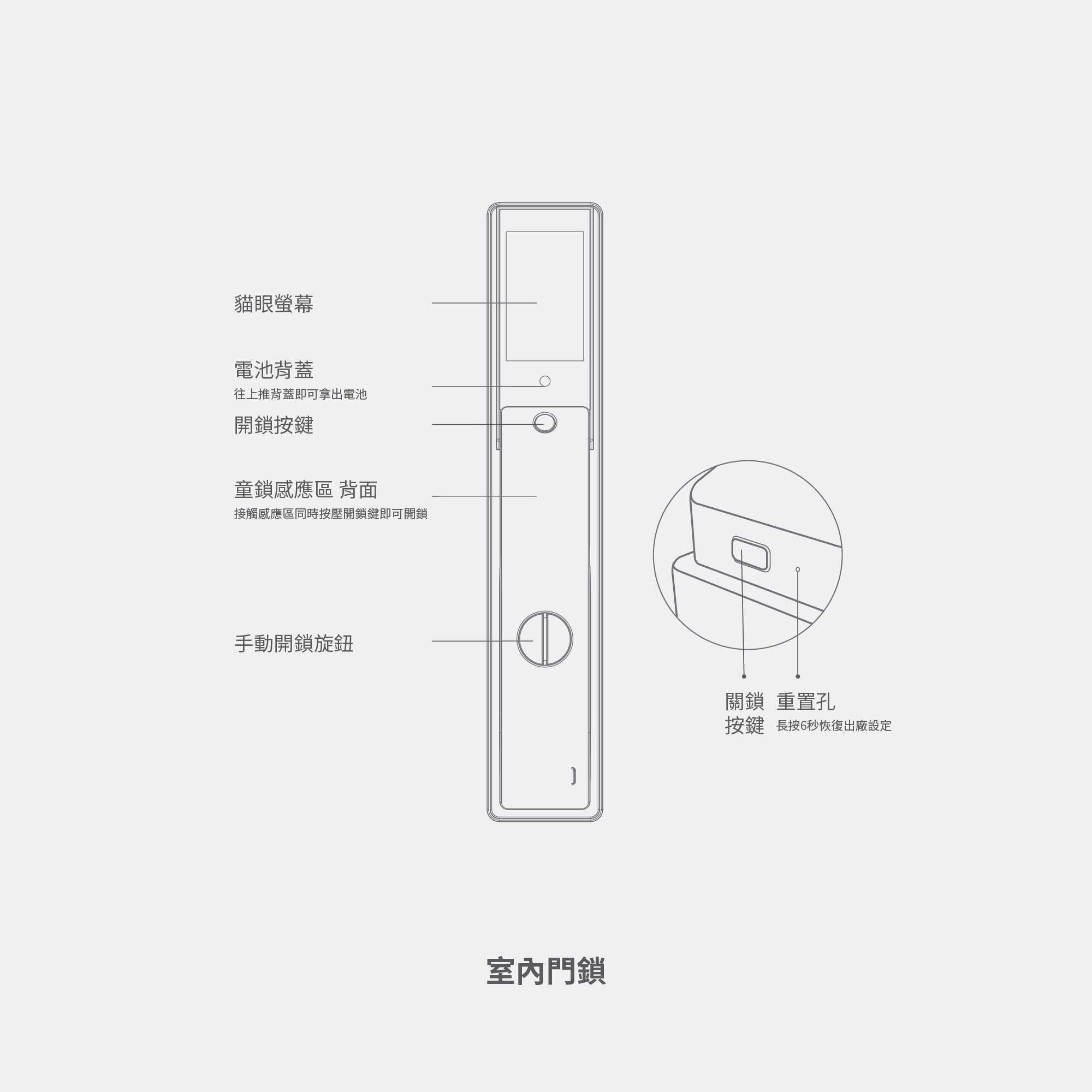 • 電子反鎖:反鎖後室外只能用鑰匙、管理者密碼、手機APP遠端、室內解鎖…等方式解鎖